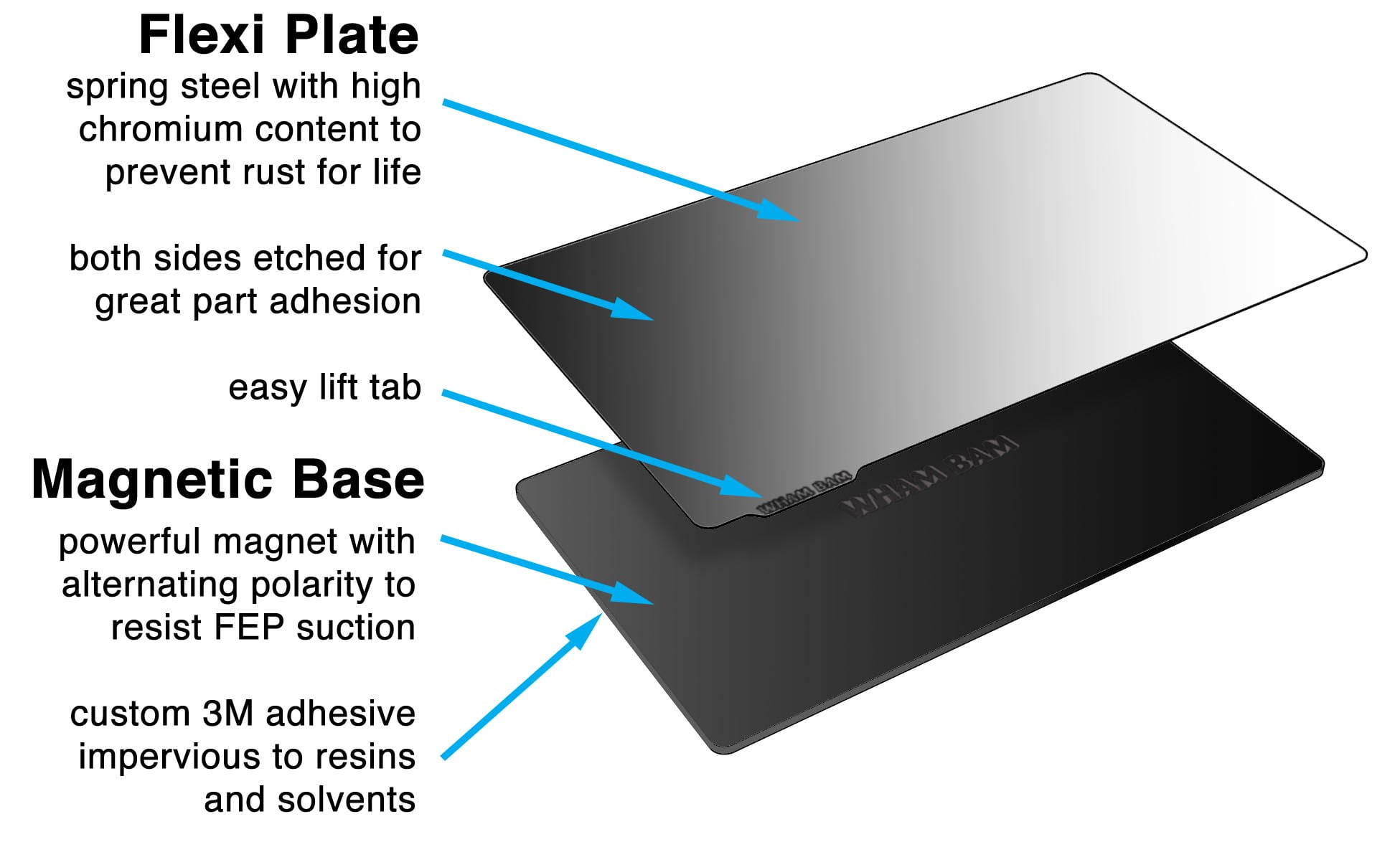 Wham Bam Flexible Build Plates for Resin са изработени от висококачествена стомана за пружини , която няма да се деформира или изкриви, когато ги огънете, те просто се връщат във формата си! Стомана за пружини е сплав с добавен хром , което я прави неръждаема и с дълъг живот, дори ако се надраска. Листа е с награпено текстурирано покритие от двете страни за отлично залепване.