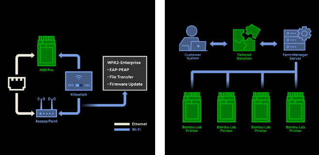 H2D Pro може да се свърже с вашите устройства чрез новодобавения Ethernet конектор, осигурявайки надеждна мрежова комуникация в сложни сценарии. Ethernet свързаността може да се използва и в ситуации с гъсто населени безжични сигнали. Освен това, H2D Pro поддържа WPA2-Enterprise Wi-Fi удостоверяване (EAP-PEAP/EAP-TLS/EAP-TTLS) и индивидуални физически прекъсвачи за Wi-Fi, отговарящи на строгите стандарти за мрежова сигурност.
