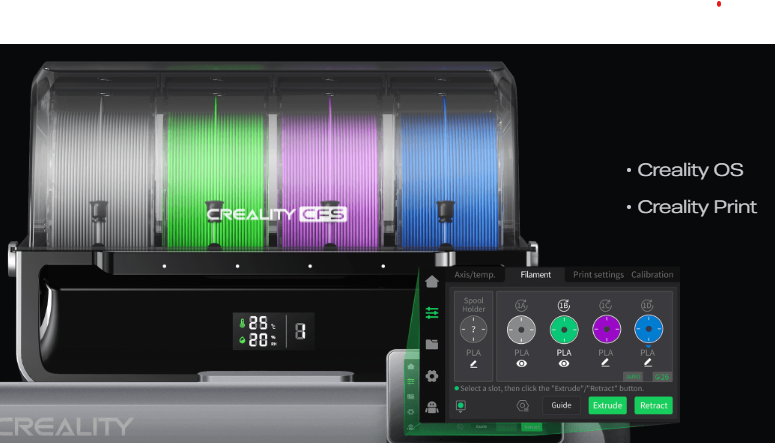 Creality K2 Combo e базовият модел от K2 серията, с включена Иновативна CFS (Creality Filament System), проектиран за потребители, които търсят високоскоростен CoreXY принтер в по-компактен, затворен корпус. Той предлага впечатляваща максимална скорост от и работи с FOC Step-Servo двигатели за прецизен печат. Това го прави отличен избор за бърз печат на основни материали (като PLA, PETG и ABS).