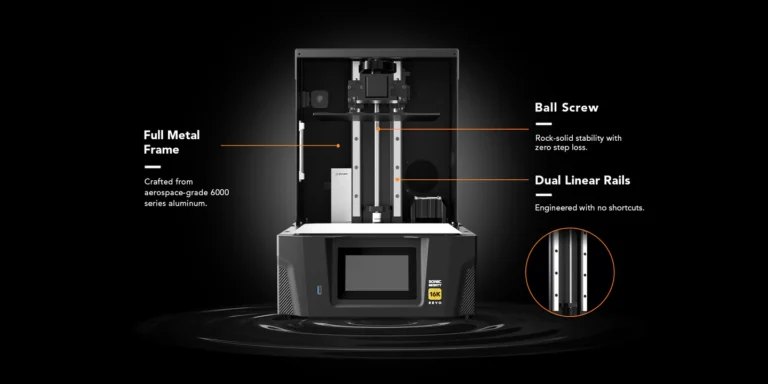 Авиационна алуминиева сплав — Здрава, стабилна и създадена за дълготрайност! Оста Z на Revo 16K е изградена с двойни линейни водачи, сферична винтова предавка и рамка от авиационна алуминиева сплав. Тази непоклатима стабилност ви дава увереност да поемате мащабни и дълготрайни отпечатъци без загуба на прецизност.