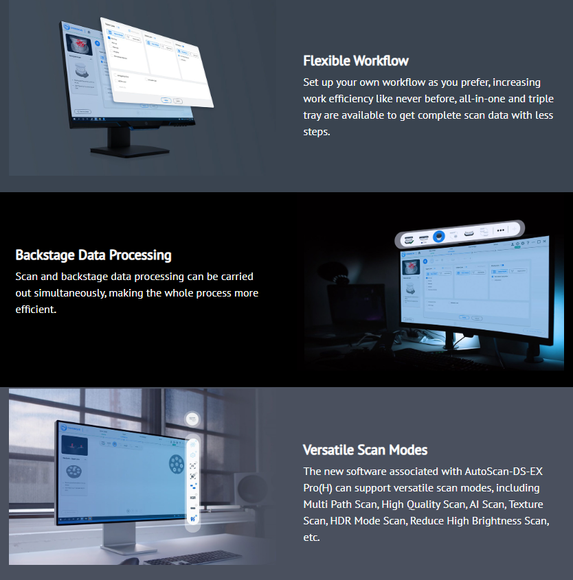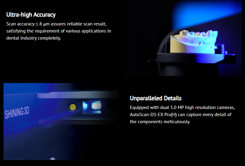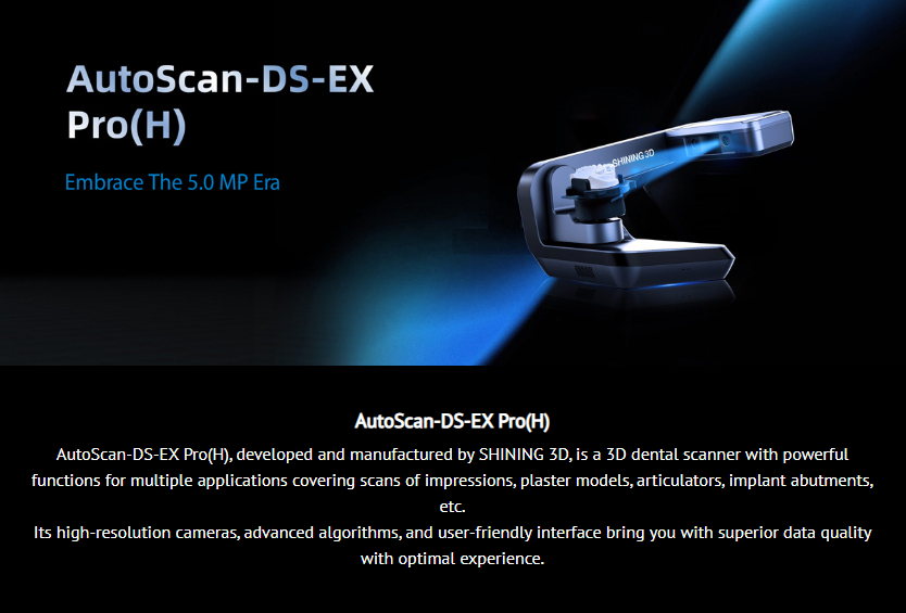 Shining 3D AutoScan DS-EX PRO H е 3D дентален скенер с мощни функции за множество приложения, обхващащи сканиране на импланти, гипсови модели, артикулатори, имплантни абатмънти и др. Неговите камери с висока разделителна способност, усъвършенствани алгоритми и удобен за потребителя интерфейс ви осигуряват превъзходно качество на данните с оптимално и лесно управление.
