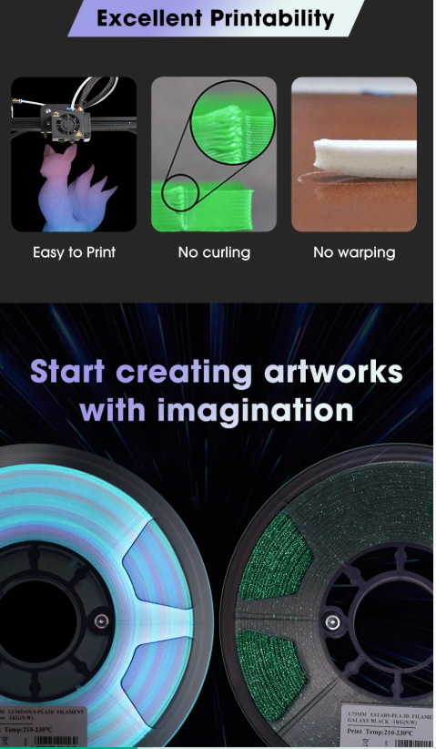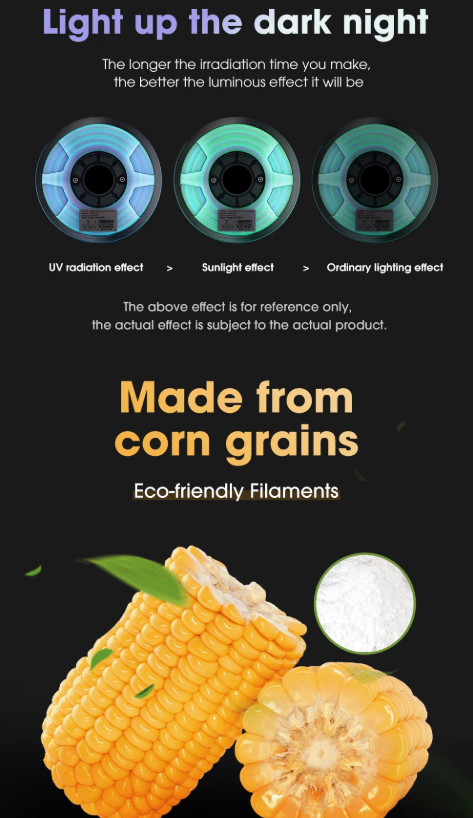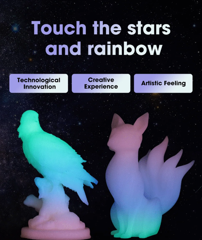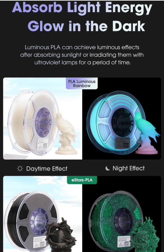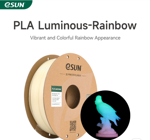 ESUN Glow in the dark Rainbow PLA е модифициран да свети в тъмното, е екологично чист материал и лесен за печат. В допълнение, като многоцветен PLA филамент, той има прекрасен ефект на сияйна дъга.