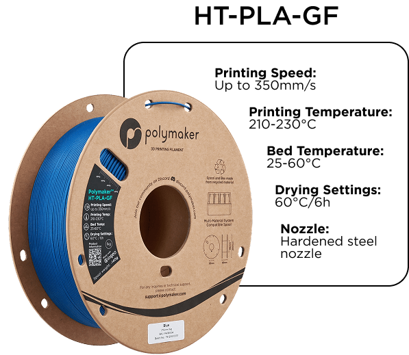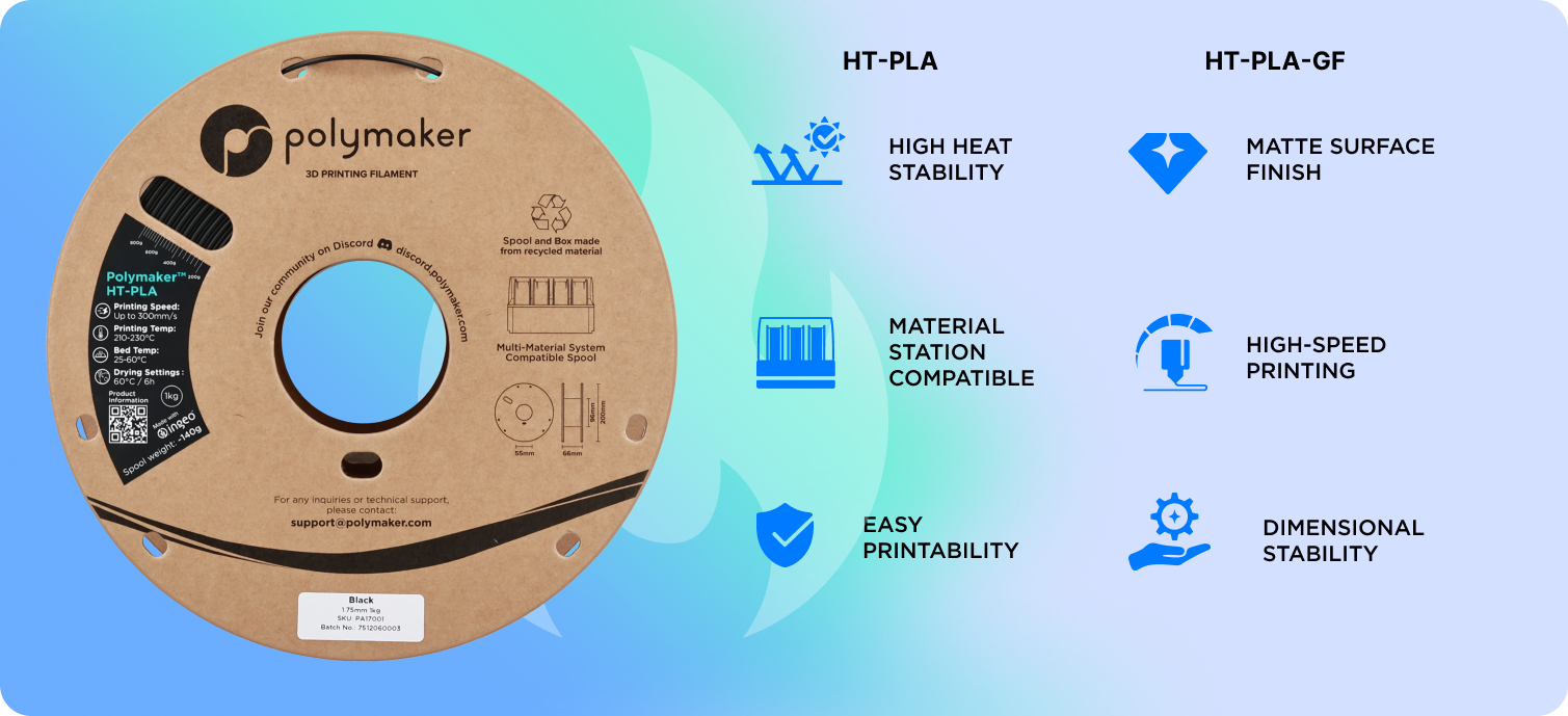 Polymaker™ HT-PLA-GF Създаден за творци, които изискват висока производителност без компромиси. Този PLA от следващо поколение е проектиран да устоява на температури до 150°C, запазвайки формата си дори при екстремна топлина — без деформации, без провисване, без компромиси.
